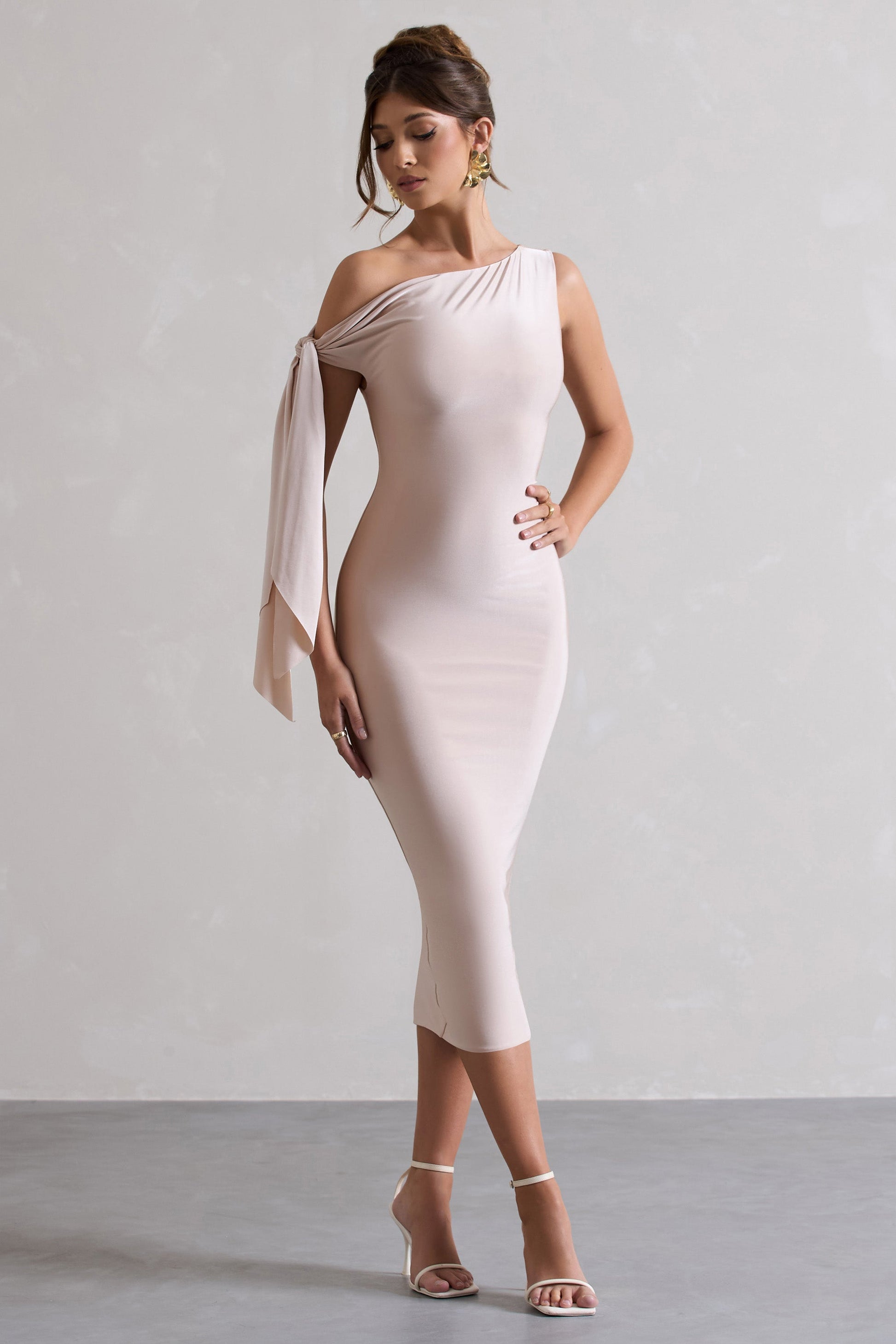Simple yet sophisticated, Adapt is a timeless addition to every wardrobe. Carefully designed in a premium jersey thats super-soft to the touch, this champagne midi was made to fit you like a glove. Defined by an asymmetric neckline highlighted by a tied drape detail, Adapt would look best styled with a sleek bun to show off all its features.