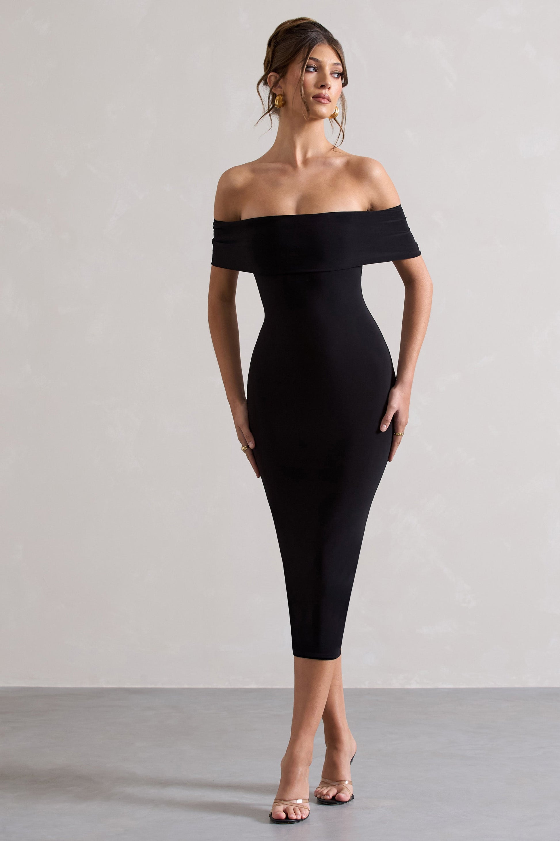 Looking for a dress that fits you like a glove? Averie is the perfect choice. Expertly cut in a black shade of our premium figure sculpting jersey, Averie boasts an elegant bardot neckline. A midi that will see you through any occasion, pair Averie with our Hear Me court heels and a sleek bun.