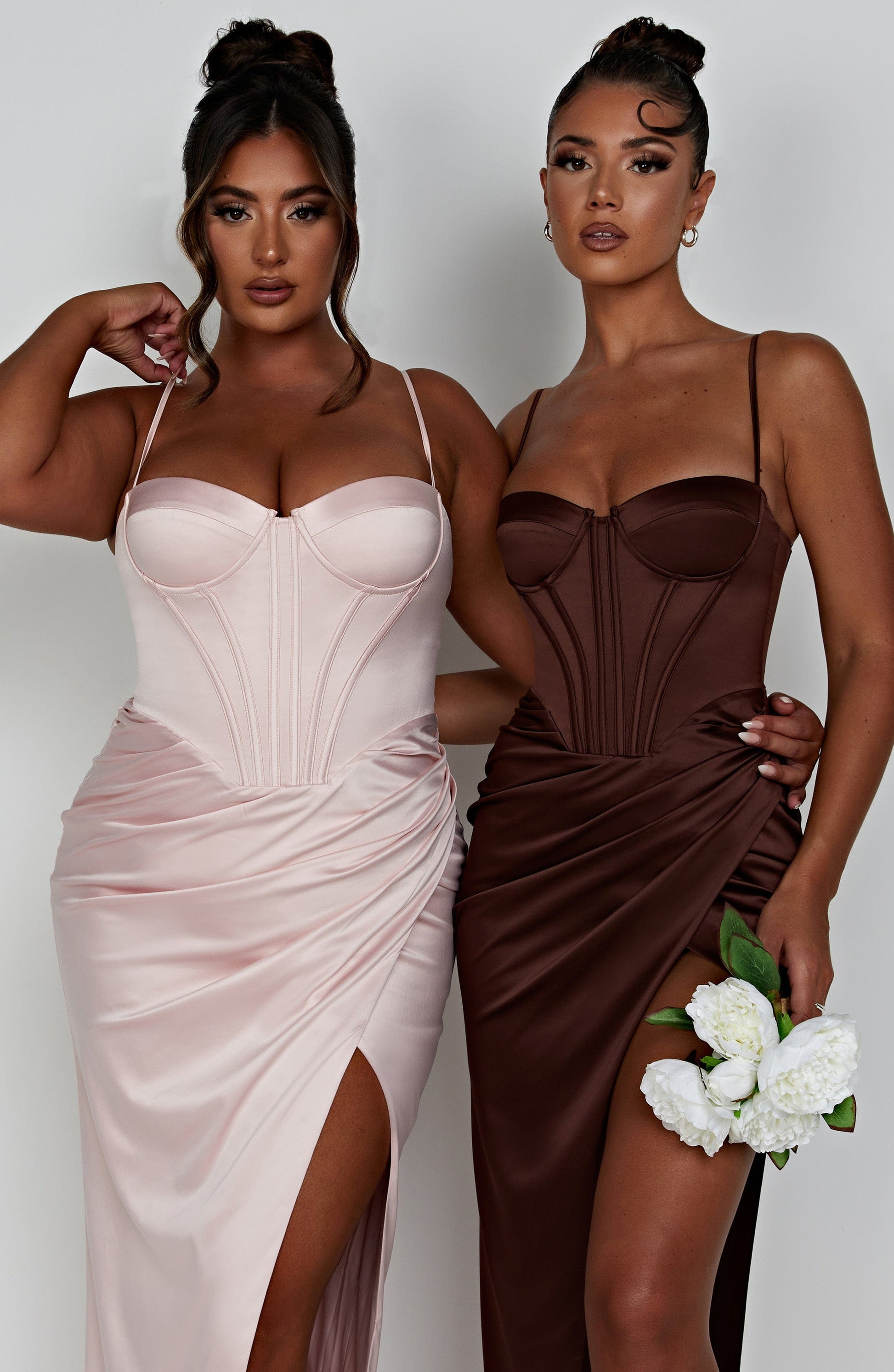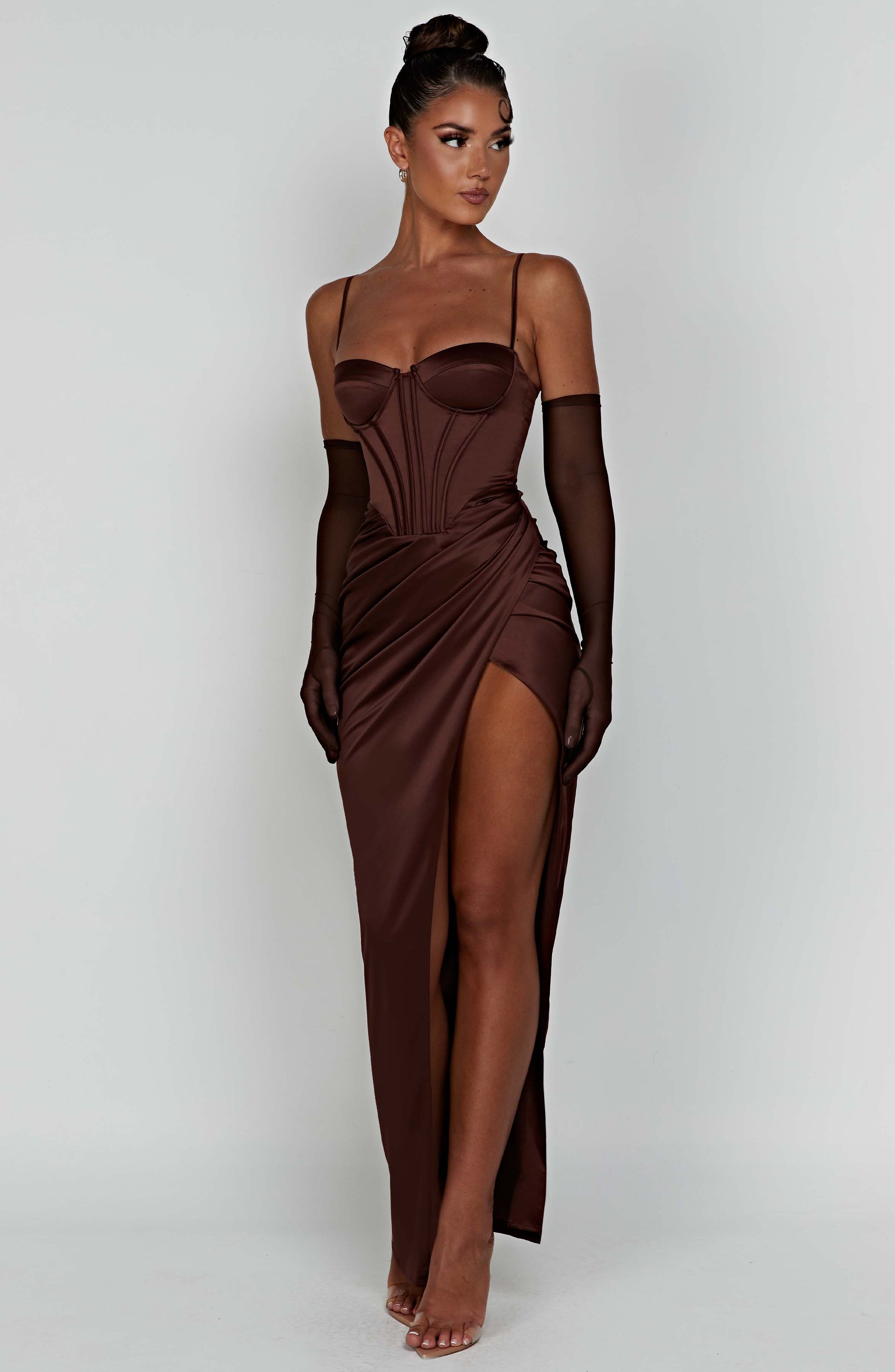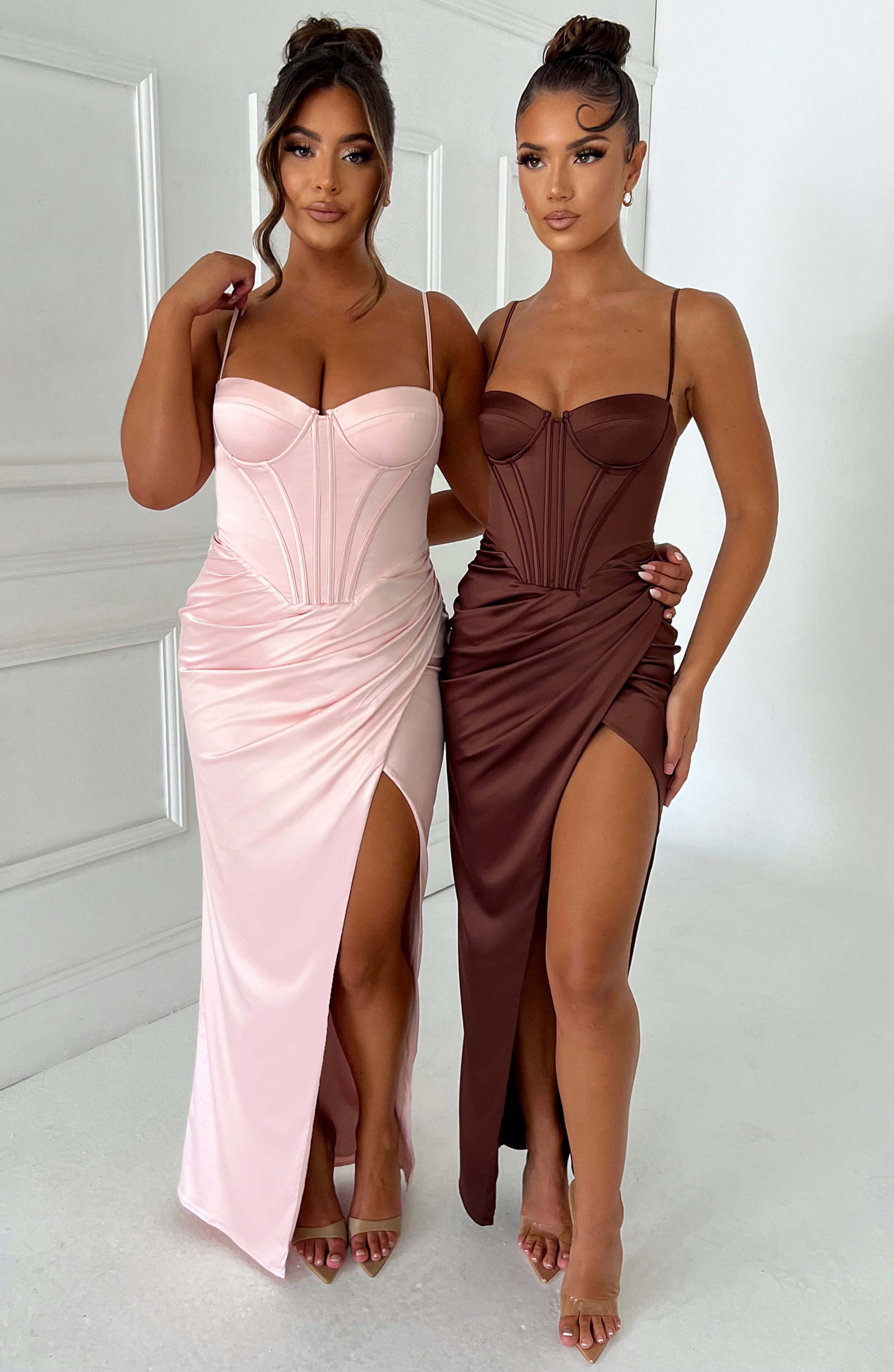 All attention, on you. The Despina maxi is a stunning choice for balls, formals, weddings and proms this season. Cut from luxury heavy satin with a stretch to skim over curves, this dreamy design is complete with a corset waist, thigh split, drape detail and underwired cups to lift and frame the bust. Style with glam waves and platforms.