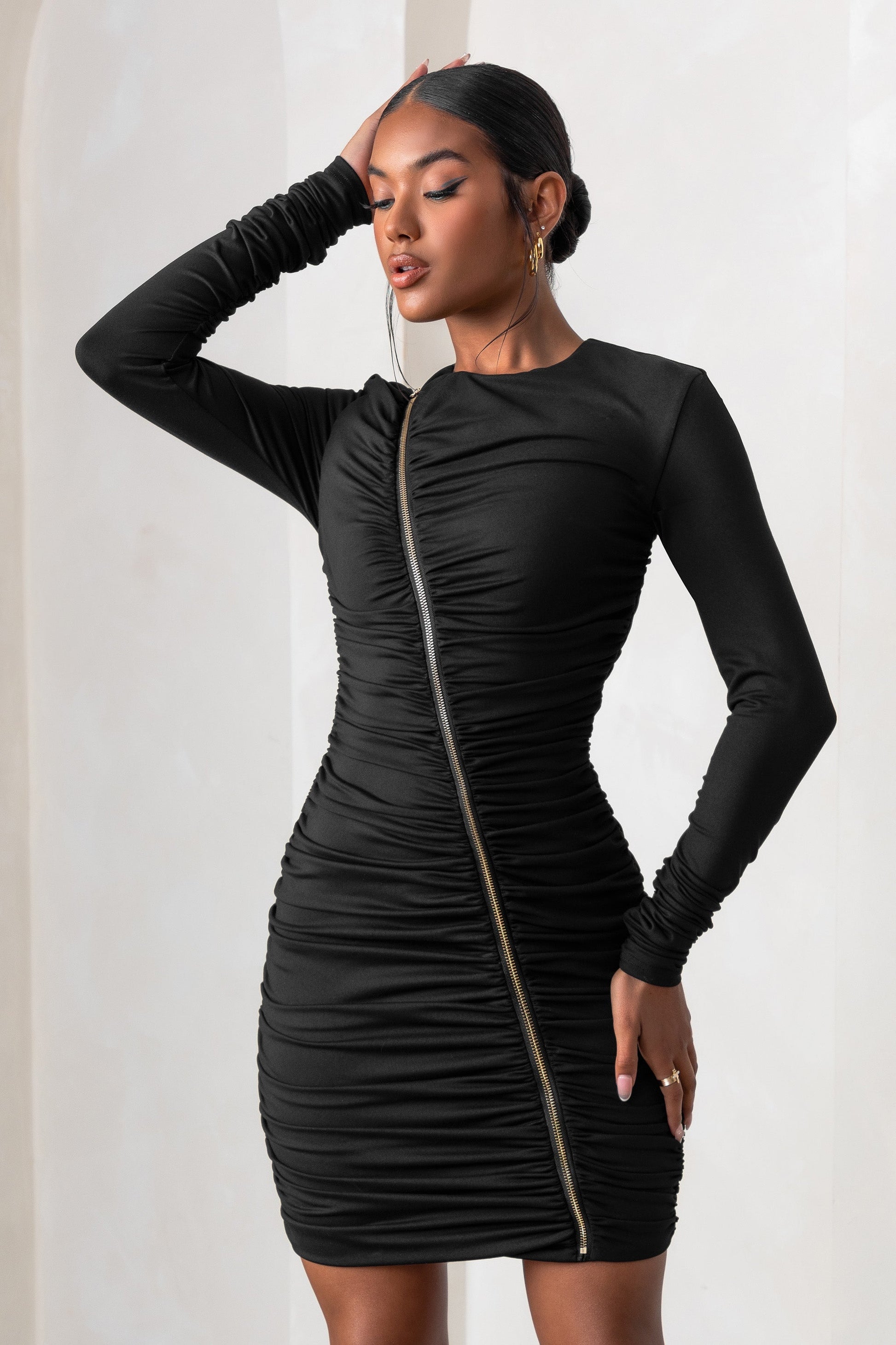Fun and flirtatious, meet our Empowered mini dress in a classic black hue. Featuring a high neckline and long sleeves for a sophisticated look, and a bold diagonal zip detail that creates a ruching throughout the design to enhance your silhouette and highlight your best assets. Wear this sleek look with heeled sandals to your next night out, cocktail night or glam party with the girls. This mini will make you look simply irresistible!