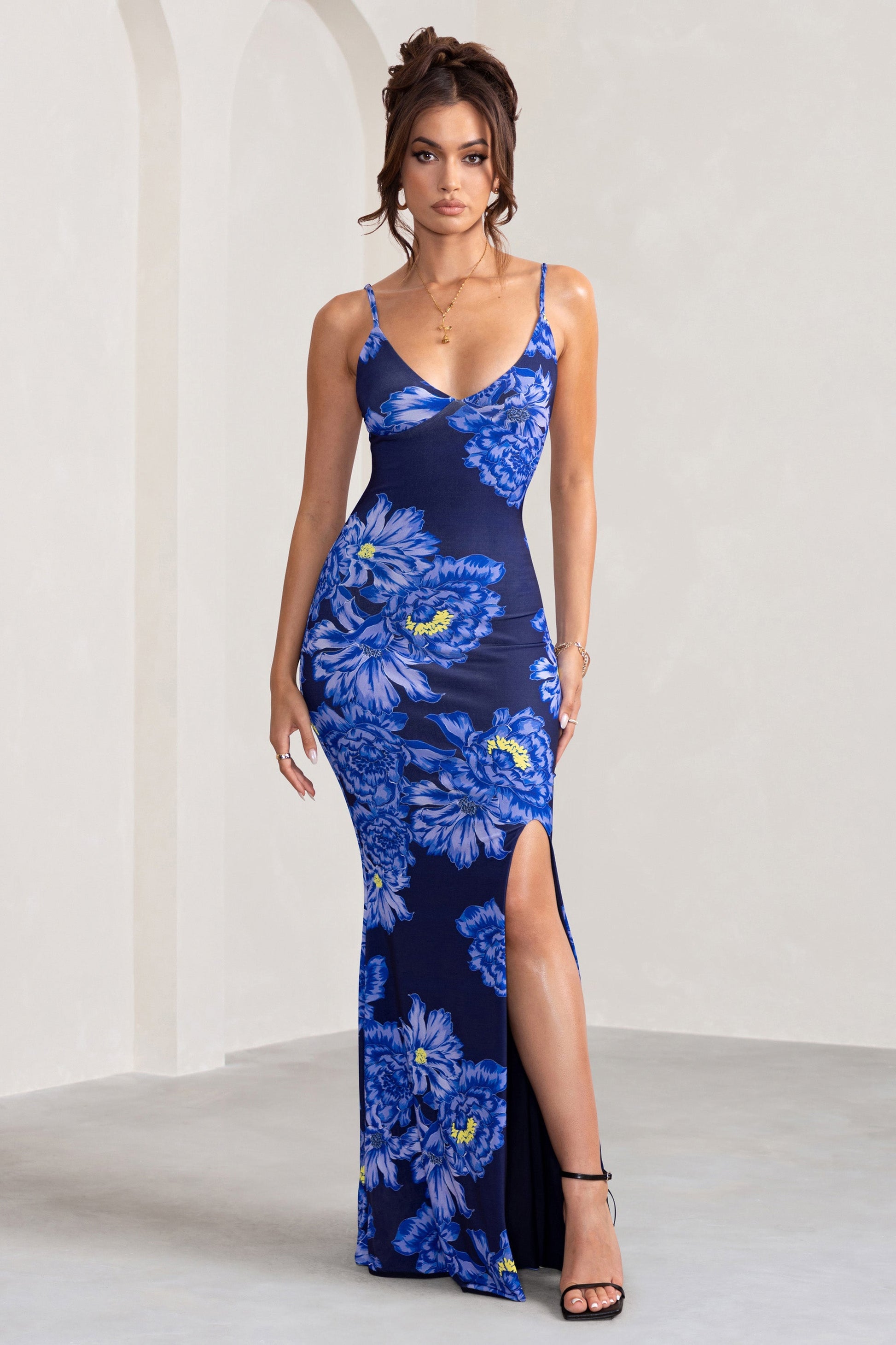It's all about the fit with our Farah maxi dress in a beautiful statement blue floral print. With a body contouring close cut fit, plunge neckline, and thigh split, this floor-length gown is a gorgeous twist on the classic maxi. This stretch jersey style will perfectly contour your curves and create a sleek, effortless look. Wear this staple maxi to your next black-tie event, glam night or VIP invite. You’ll be an icon with this exquisite design!