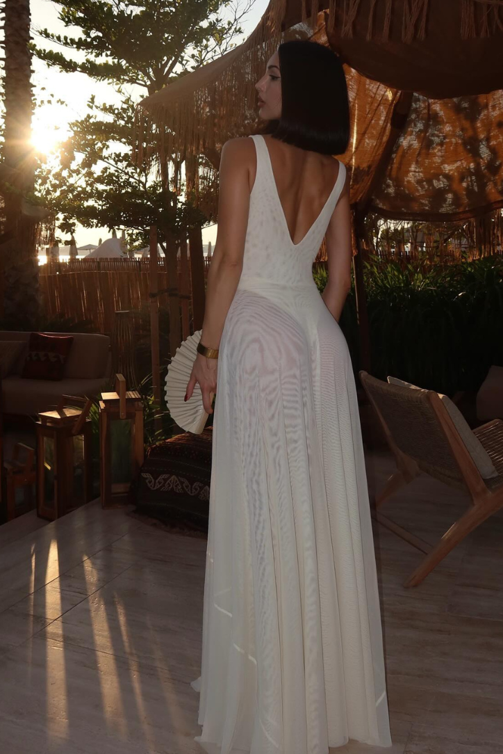 The floor-length mesh skirt drapes with fluid grace, creating dramatic movement as you walk. Intricate detailing and a sheer finish add layers of dimension and luxury, making Karolina the perfect choice for red carpet moments, formal events, or any night you plan to leave a lasting impression.