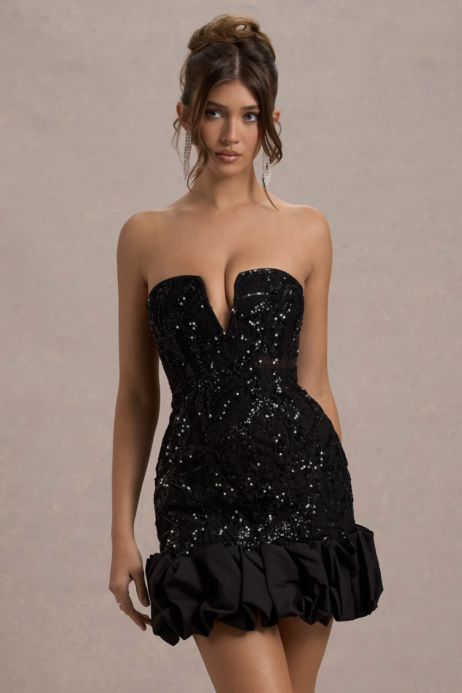 Nadia | Black Sequin Strapless Mini Dress With Ruffle Trim