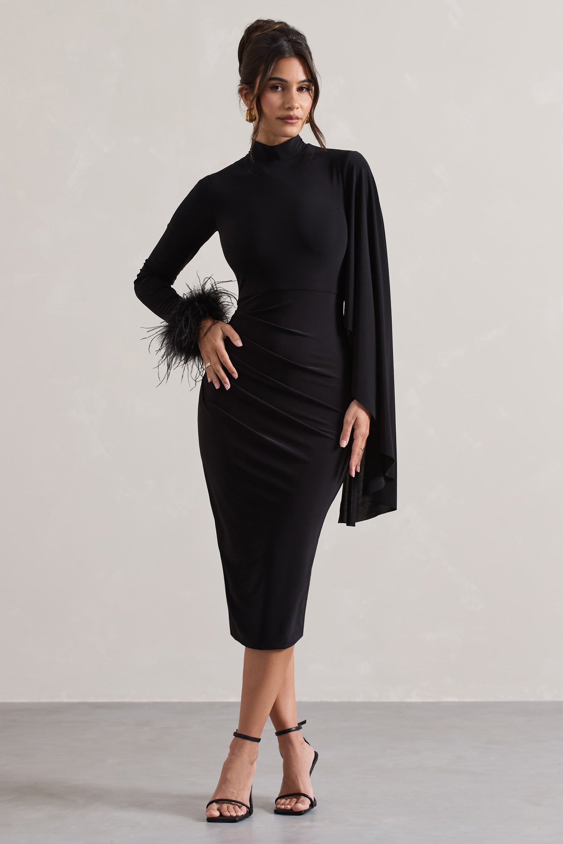 Tamika | Black High-Neck Cape-Sleeve Midi Dress With Feathers