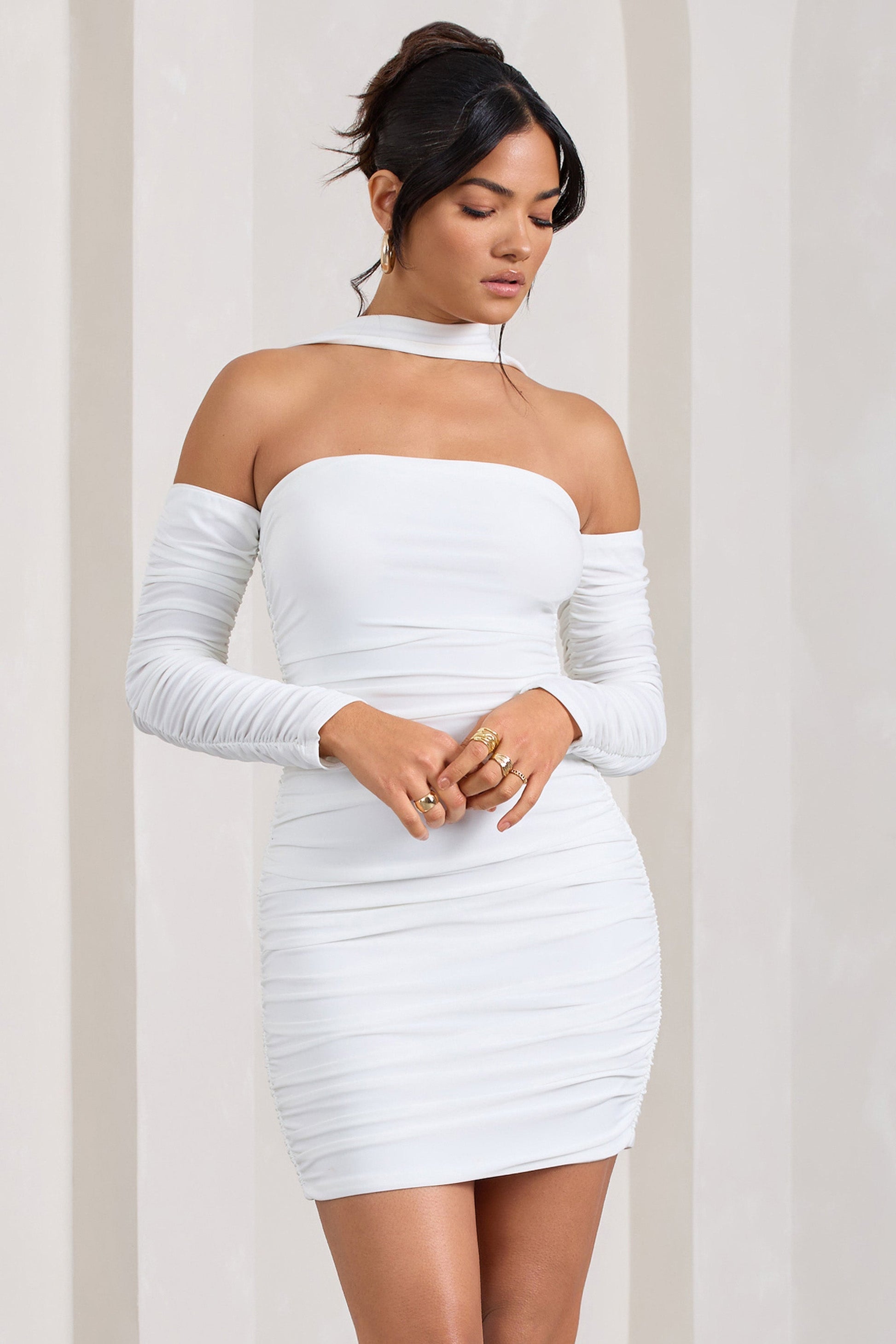 Thea | White Ruched Long-Sleeved Bodycon Mini Dress With Halter Collar