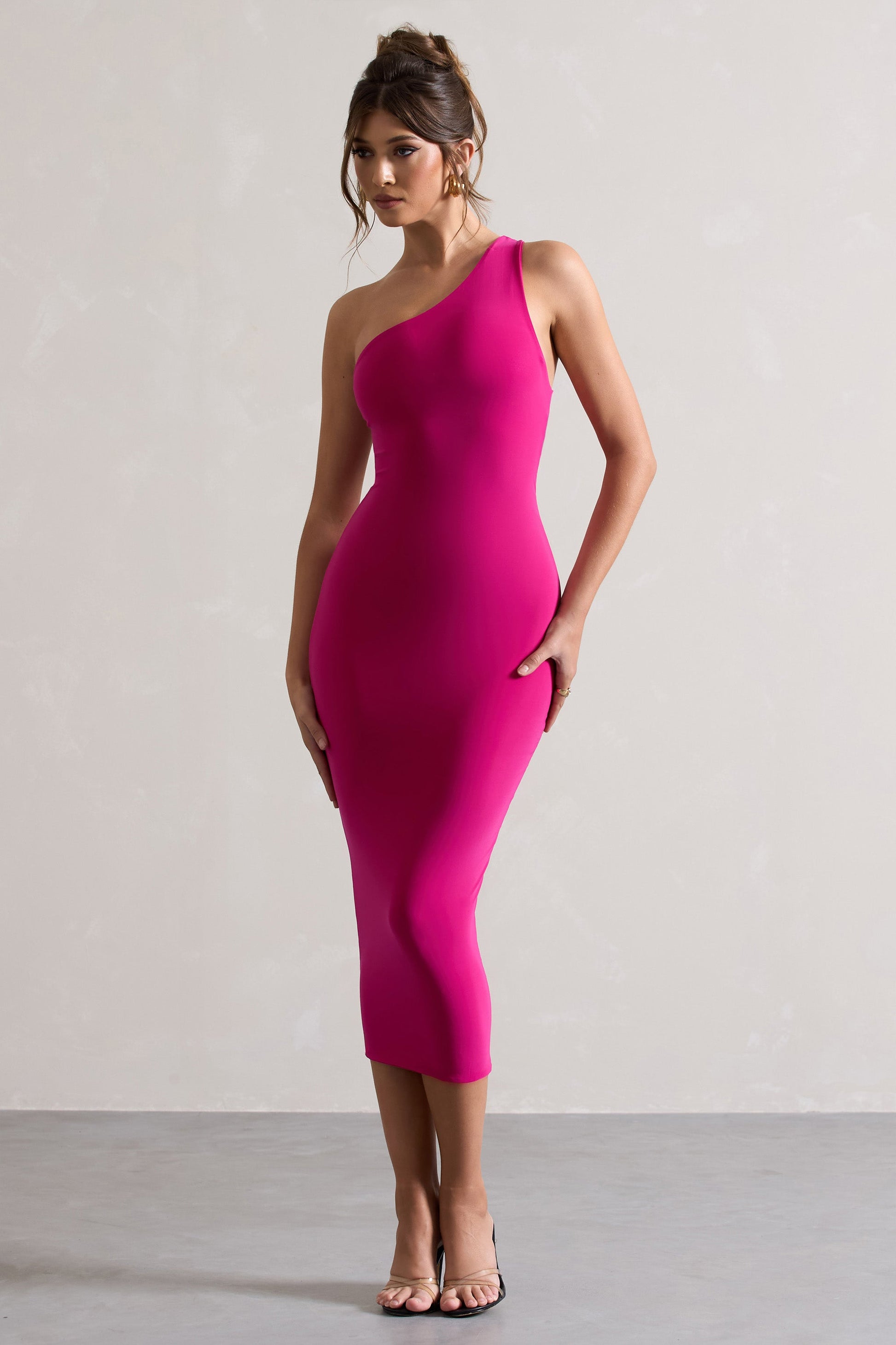 This hot pink bodycon dress is not only classic in an asymmetric silhouette but its premium stretch jersey composition makes it also incredibly comfortable. Vineyard is adorned with one wide strap that artfully loops over an open back. Style this must-have midi dress with strappy heels and statement hoops for a versatile look suited to any special occasion.